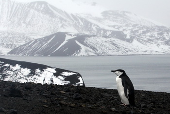 אנו ממשיכים לשפת הלוע הגדול, שייתכן ונוצר בהתפרצות האחרונה, ב-1970. אנו מתרחקים מעט לבל נחליק פנימה. הליכה יפה על המצוק הרך, מול נוף קסום, "איסלנדי" באופיו, שחור מטוף ולבן מקחר, אלא שלראות נוף כזה באיסלנד צריך ללכת ימים, וכאן אנו מול החוף.  עוד טיפוס קל, ואנו מגיעים לנקודת נוף נוספת, המשקיפה על עוד לועות געשיים, עוד אגמים זעירים, עוד שלג מכוסה בגרגירים שחורים. ממשיכים ללכת, שיכורים מיופי, פוסעים בנוף "ירחי" לחלוטין, לפנינו פינגווין פס הסנטר. כמו לפי פקודה מגבוה, אנו מסתדרים בטור, לבל נפריע לו לנוע. הוא מתבונן בנו בסקרנות ואנו מצלמים בהתרגשות. לפעמים פינגווין אחד מסעיר יותר מאלפים. מבט על הקלדרה כולה, עם ספינתנו בתווך, כשבצד נראות סירות הזודיאק. אנו מחליקים על המדרון, משתדלים לרדת בנתיב אחד. הטוף הבוגדני מושך אותנו מטה מטה. אנו גולשים לערוץ מלא שלג והופ, אנו בחוף. פינגווין גנטו פוסע מעדנות. לרגע נבהל והופך אלינו את גבו. הרוח שורקת. עוד רגע אנו בזודיאק , עוד רגע חזרה בספינה עם כוס שוקו חם, מתבוננים בנוף, אבל הפעם, מוגנים מקור על ידי זכוכית.