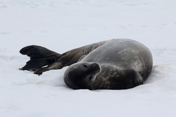 אנו מטפסים אל להקה של פינגוויני פס הסנטר. חלקם דוגרים, חלקם קוראים לבן הזוג להחליף משמרת. ניתן היה לראות את הגוזלים נעים באי נוחות, יוצאים מתחת להורה התורן ובורחים פנימה מפניה קור. הלכנו על מיצר יבשה קטן, שהיה מכוסה בחלוקי גרניט שהגיעו עם הקרחון. ייתכן שזוהי נקודת המפגש של שני קרחוני ענק, שפעם גלשו הנה וכיום הם נמצאים מעבר למפרץ. על סלע גדול מעלינו דגר שחף, על שלושה גוזלים. הוא שמר עליהם לא רק מחמסנים אלא גם מבני מינו. המדריך ברנט בדק חומר שהוקא על ידי שחף וגילה בו סימנים לגוזל, של שחף אחר. לאחר שצפינו בכמה פסגות מושלגות שבצבצו מעל לשמיכת העננים, עברנו לצדו השני של המיצר, שם נאלצנו להתבוסס שעה ארוכה בשלג עד שהגענו לכלבי ים מסוג וודל, שלמרבה האירוניה נקרא על שמו של צייד כלבי ים. לפחות שמונה או תשעה ששכבו בשלג באפס מעשה. בים הם יודעים להיות מהירים וטורפים חזקים, אבל כאן, בייבשה, שכבו בעצלות. מעת לעת התמתח אחד מהם, נפנף בסנפיריו, מתח את צווארו ולאחר שסיים את ההצגה, חזר לתנומה.