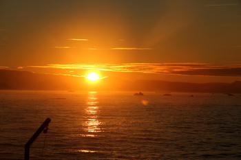 22:30. השמש שולחת קרניים אלכסוניות של אור רך, התופר לעננים שולי זהב. גם השמים נצבעים בגוונים חמימים והקרחונים זוהרים בגווני צהוב. אני עולה לסיפון העליון, הרוח הקרה צורבת את פני. כדור שמש ענקי בפאתי מערב. מנסה למצות כמה שיותר מהיום היפה הזה, שאין רבים כמותו.