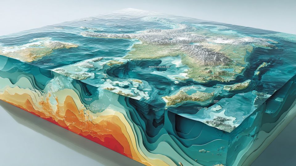 איור מדעי של שינוי אקלים  המתאר את השפעות העתיד על הים הבלטי. מבט אלכסוני מוגבה, דמוי־מפה, על אגן הים הבלטי והחופים המקיפים אותו, המדגיש את אופיו כים רדוד, סגור למחצה, ובעל חילוף מים מוגבל עם הים הצפוני והאוקיינוס האטלנטי. מעברי צבע הדרגתיים על פני הים מציינים עלייה בטמפרטורת פני המים, גבוהה מזו של האוקיינוסים הפתוחים הסובבים. חתך מושגי ברור או הדמיה שקופה של עמודת המים מציגים התחזקות של ריבוד תרמי: שכבת פני־מים חמה, תרמוקלינה חדה ושכבות עמוקות קרירות יותר. אזורי העומק מציגים התרחבות של אזורים דלי־חמצן (היפוקסיים) ואף חסרי חמצן (אנוקסיים) בקרקעית הים, המודגמים ככתמים כהים ועדינים בגווני כחול־אפרפר. סממנים עדינים של אוטרופיקציה נראים בקרבת חופים ושפכי נהרות: זרימת נוטריינטים מוגברת, פריחות אצות וירידה בצלילות המים. הנופים החופיים הסובבים — נמלים, אזורי דיג, שטחים ביצתיים ומפרצים רדודים — מרמזים על פגיעוּת אקולוגית וכלכלית, היררכיה חזותית ברורה: תחילה הגאוגרפיה בקנה מידה אגני, לאחר מכן דפוסי הטמפרטורה, אחריהם תהליכי עמודת המים ולבסוף ההשפעות האקולוגיות.