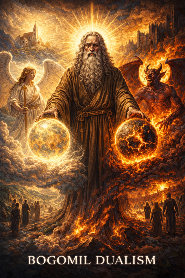 האמונה הבוגומולית היא סוג של דואליזם מרוכך. על פי אמונה זו, לאל הזקן נולדו שני בנים, הבכור שטנאל (שטן) והצעיר מיכאל. הבכור, שטנאל ברא את העולם והבן הצעיר, מיכאל, שהתגלגל לדמות אדם כדי לגאול את האנושות, הוא ישו ורוח הקודש היא צאצא של ישו. רוח הקודש הולידה את המלאכים ואת השליחים, כולל יהודה איש קריות.