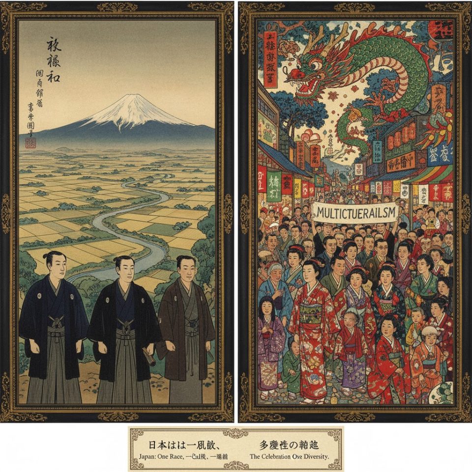 היפנים אינם עם אחיד במובן הגנטי או התרבותי, אלא חברה מורכבת, שבה האחדות נבנית דרך דמיון קולקטיבי.[21] המיתוס של "עם אחד, תרבות אחת" ממשיך להעניק תחושת זהות וביטחון, אך גם דורש בחינה מחודשת נוכח מציאות רב-תרבותית הולכת ומתרחבת. עבור המבקרים שוחרי האנתרופולוגיה, יפן היא מעבדה חיה של זהות תרבותית במבחן – מקום שבו הרמוניה משמשת הן כחזון והן כמסך, שמאחוריו מתנהלת חברה מגוונת, משתנה ומודעת יותר לעצמה מאי פעם.
