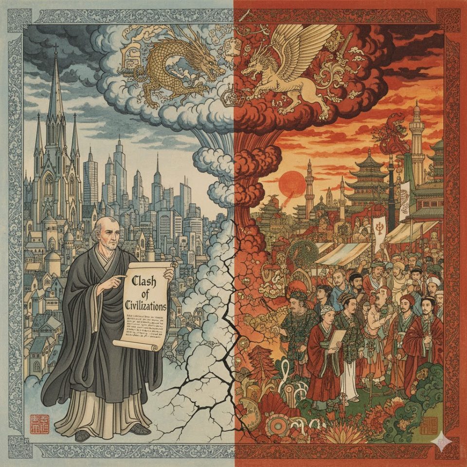 "התנגשות הציביליזציות" היא תאוריה, שהוצעה על ידי הפרופסור למדע המדינה סמואל הנטינגטון ((Samuel P. Huntington, 1927–2008))[3], אשר בעיקרה נאמר כי הזהות התרבותית והדתית תהיה המקור העיקרי של הסכסוכים בעולם שלאחר המלחמה הקרה. ראשיתה של התאוריה היא בהרצאה מפיו של הנטינגטון שנשא בעקבות פרסום הספר "קץ ההיסטוריה והאדם האחרון" (1992) ב"מכון האמריקני ליוזמה". בשנת 1996, פרסם הנטינגטון ספר בנושא.[4] בספרו הוא מחלק את העולם על רקע תרבותי. האם יפן עומדת בהגדרה זו של ציוויליזציה הומוגנית? ויותר מזה, האם אנשי יפן הם גזע נפרד והומוגני? להגדרת הנטינגטון, ציוויליזציה מורכבת מקבוצות חברתיות (כמו מיעוטים אתניים ודתיים). הדת היא המרכיב המאחד העיקרי, אך גם שפה וקרבה גאוגרפית מהוות גורם חשוב. מאידך גיסא, ציוויליזציה אינה מחייבת דת, גזע או שפה משותפים. ציוויליזציה יכולה לכלול קבוצות רחוקות תרבותית. זו למעשה הישות התרבותית הרחבה ביותר בין תרבויות נבדלות. הנטינגטון מגדיר שציוויליזציה היא הישות התרבותית הרחבה ביותר, המגדירה אחידות תרבותית. ולגבי גזע נפרד, מיום השלמת פרויקט ריצוף הגנים של האדם, קל להתחקות אחר מוצאים שונים, וקל להגדיר גנטית קשרים בין בני אדם, ובכך להגדיר קרבה גזעית בין אנשים.