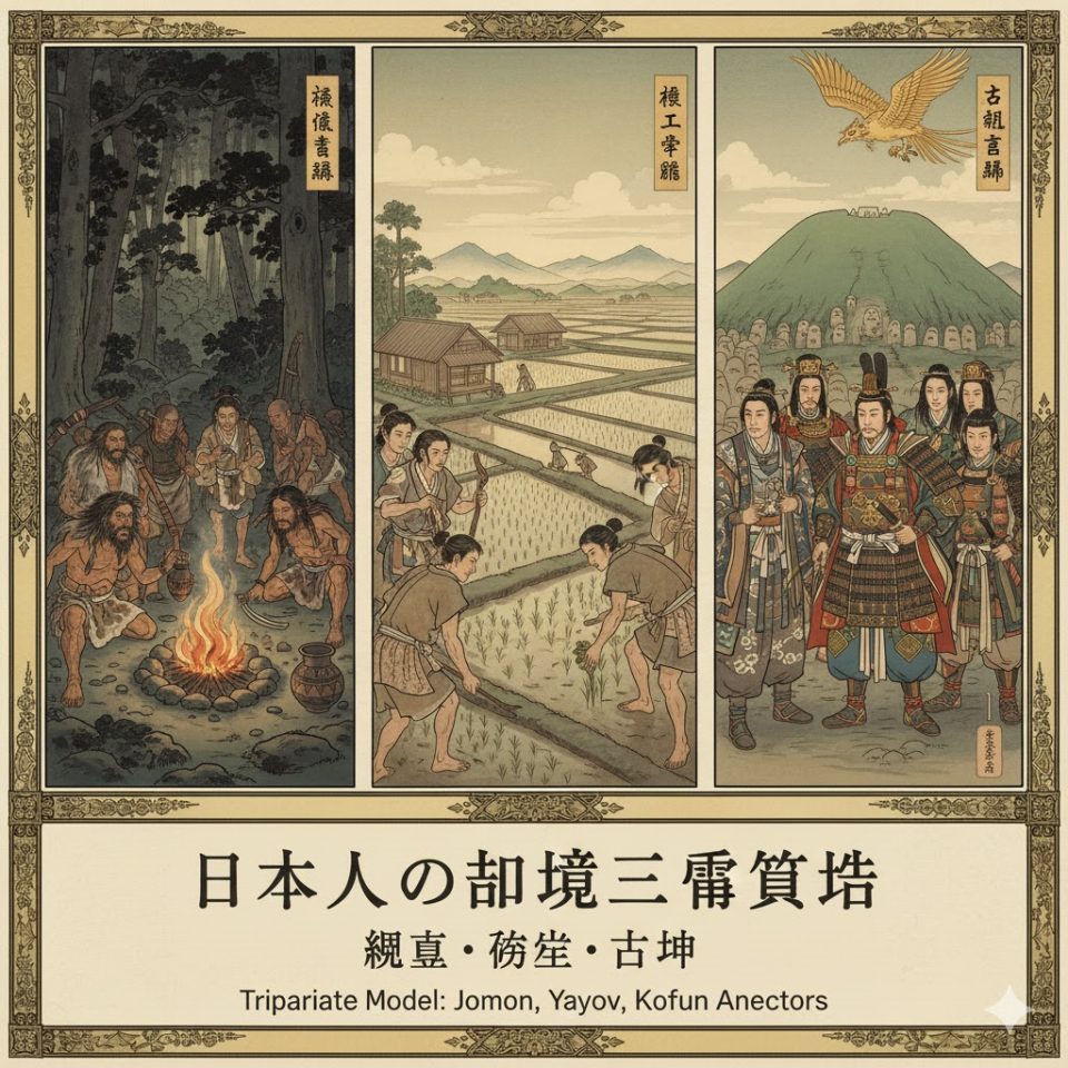 האנתרופולוגים המודרניים מציעים מודל היסטורי תלת-שכבתי (Tripartite Model) של התפתחות האוכלוסייה. לפי גישה זו, היפנים בני זמננו הם צאצאים של שלוש קבוצות היסטוריות עיקריות: ג'ומון, יאיוי, וקופון (Kofun).