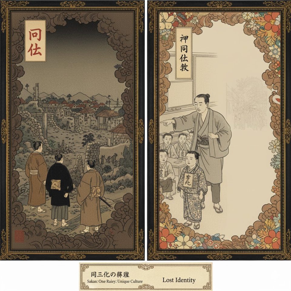התרבות המקומית הוגדרה "נחשלת", השפה הריוקיואנית נאסרה בבתי הספר, וילדים נענשו אם דיברו בה. תהליך ה"דוקה" (Dōka – "התאמה") נועד לטשטש כל סממן של זהות נפרדת. בני אוקינאווה נדרשו "להיות יפנים טובים" – אך לעולם לא הוכרו ככאלה באמת. תהליך זה אף הואץ כאשר השתלטה יפן על טאיוואן ב-1895 ואוקינאווה חדלה להיות בקצה הרחוק.
