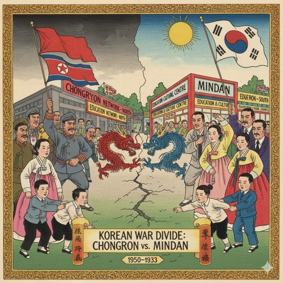 מלחמת קוריאה (1950–1953) הוסיפה קרע פנימי בתוך הקהילה. שתי תנועות יריבות, צ'ונגריון (Chongryon) המזוהה עם צפון קוריאה ו־מינדאן (Mindan) המזוהה עם דרום קוריאה, התחרו על הנהגת הקהילה. כל אחת מהן הקימה רשת חינוך ותרבות משלה. בתי הספר של צ'ונגריון לימדו בקוריאנית והדגישו נאמנות לפיונגיאנג, אך נתקלו באפליה קשה מצד הרשויות. תלמידים מבתי ספר אלה הוטרדו לא אחת, ובתי הספר נותרו מחוץ למערכת התמיכה הציבורית.