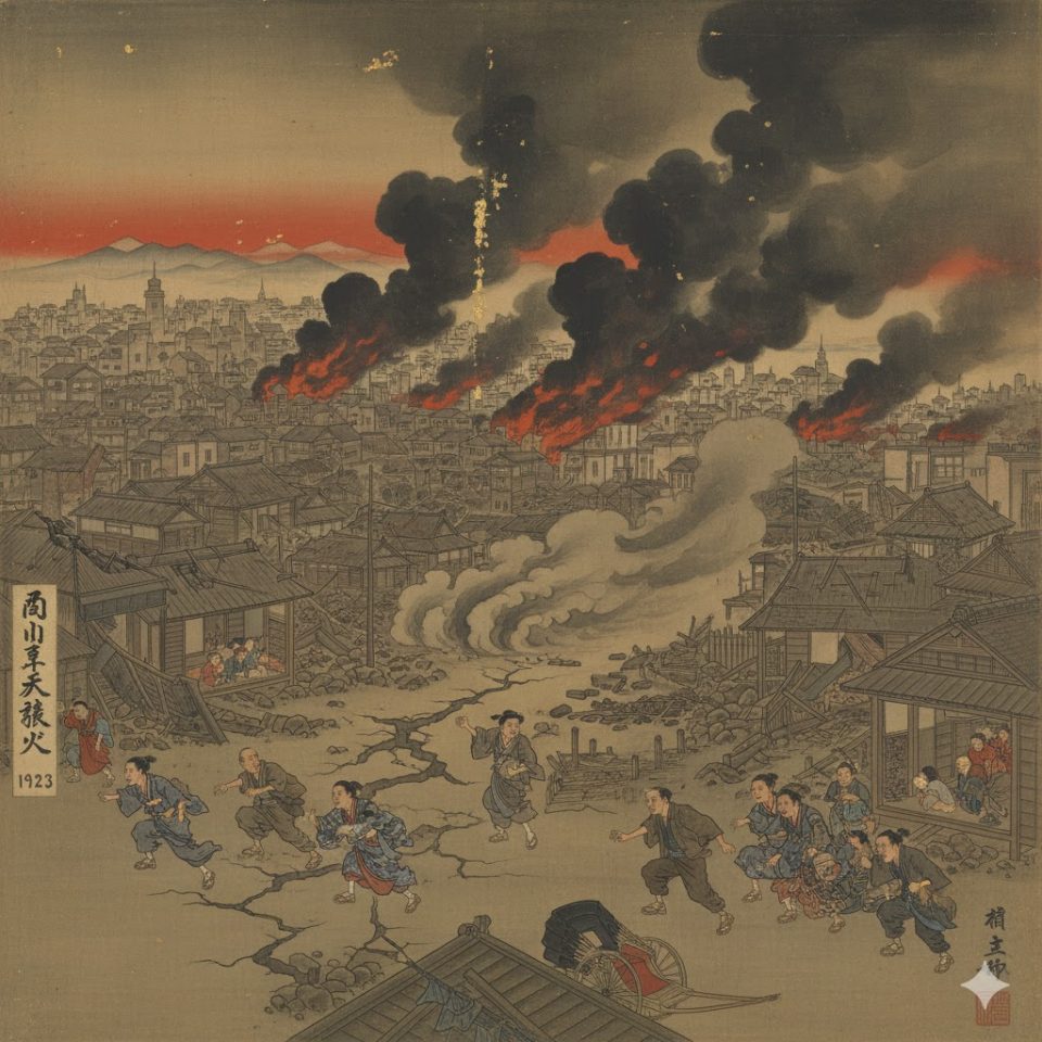 [19] רעידת האדמה הגדולה בקאנטו (Kantō Daishinsai) התרחשה ב־1 בספטמבר 1923 והייתה אחת הקטסטרופות הגדולות בתולדות יפן. מוקד הרעידה היה במפרץ סגאמי, מדרום לטוקיו וליוקוהמה, ועוצמתה הוערכה בכ־7.9 בסולם ריכטר. הרעידה ארכה כחמש דקות וגרמה להרס עצום – מאות אלפי מבנים קרסו, שריפות ענק פרצו כתוצאה מפיצוצי גז ותנורי בישול, וגלי צונאמי פגעו בחופים הסמוכים. ההערכות מדברות על כ־140,000 עד 150,000 הרוגים, וכמיליון חסרי בית. מעבר להרס הפיזי, האסון הוליד גם משבר חברתי חמור: שמועות על מרידות כביכול הובילו לפוגרומים נגד מהגרים קוריאנים ולינצ'ים המוניים, ולעיתים השתתפו בהם גם שוטרים וחיילים. רעידת האדמה חשפה את שבריריותה של יפן המודרנית ואת מתיחותה החברתית בתקופה שבין המלחמות. בתגובה לכך פתחה הממשלה בתוכנית שיקום נרחבת, שכללה תכנון עירוני חדש לטוקיו וליוקוהמה, הקמת מבני ציבור עמידים לרעידות אדמה ושדרוג תשתיות. האסון נצרב בזיכרון הקולקטיבי כנקודת מפנה בעיצוב פני יפן המודרנית, ויום ה־1 בספטמבר מצוין מאז כ"יום ההגנה מפני אסונות טבע" (防災の日, Bōsai no Hi), יום זיכרון ותרגול לאומי שנתי להיערכות לרעידות אדמה ולצונאמי.