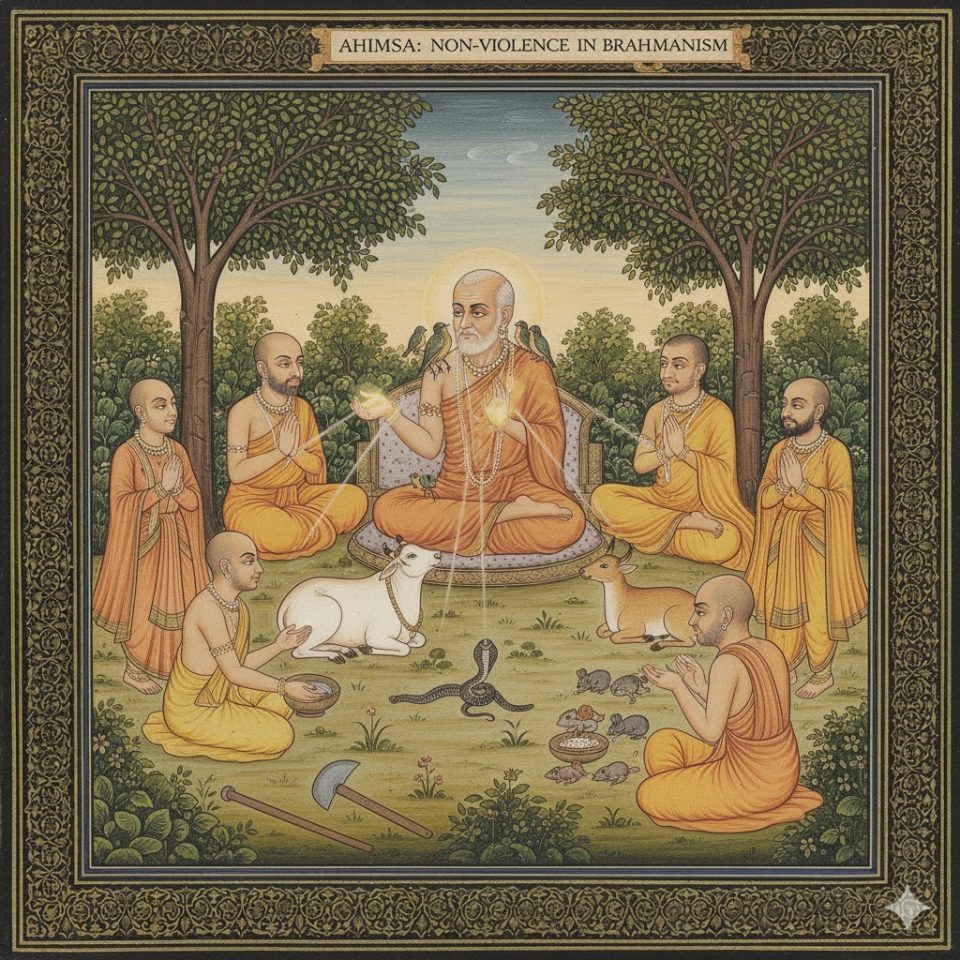 תהליך הדרגתי הנמשך עד היום. רישומה ניכר בסנסקריטיזציה של האלוהויות המקומיות והפולקלור המקומי, זיהוי של מקומות פולחן עם אפיזודות מסוימות מתוך האפוסים הסנסקריטיים והתאמתם של מנהגים עממיים לדיני הברהמינים. סימן היכר חשוב לברהמניזם הוא אַהִימְסָה (Ahimsa) – "אי אלימות" במעשה ובמחשבה, וודאי שבראשה שלילת נטילת חיים.