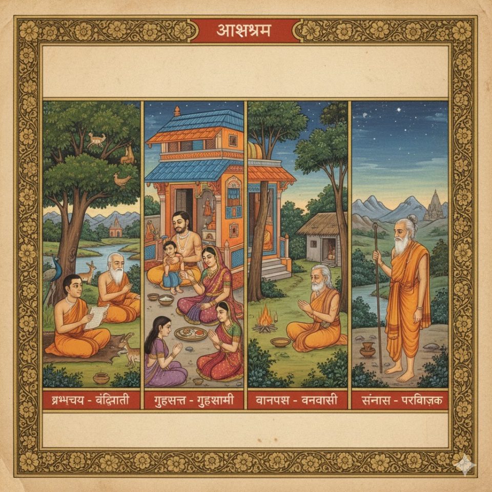 בהינדואיזם, חיי האדם מחולקים לארבעה שלבים עיקריים המכונים אשרמות (Āśramas). מערכת זו מתארת את הדרך האידיאלית לחיים מאוזנים, שבה כל שלב מוקדש למטרות שונות – לימוד, אחריות חברתית, פרישות וחיפוש רוחני. ארבעת האשרמות נועדו להנחות את האדם במסעו מן החומרי אל הרוחני, וליצור איזון בין חובותיו כלפי עצמו, משפחתו והיקום.