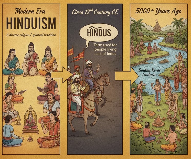 המסורת הנקראת 'הינדואיזם', היא תולדה של 5000 שנות התפתחות. אולם שם זה ניתן לה רק במאה ה-12' בערך, על ידי הפולשים המוסלמים. באופן היסטורי המונח "הינדו" קדם להתייחסות להינדואיזם כאל דת. המונח הוא ממקור פרסי, מקורו כנראה במילה "סינדהו" (Sindhu) והוא התייחס במקור לאנשים שגרו מעברו המזרחי של נהר האינדוס.