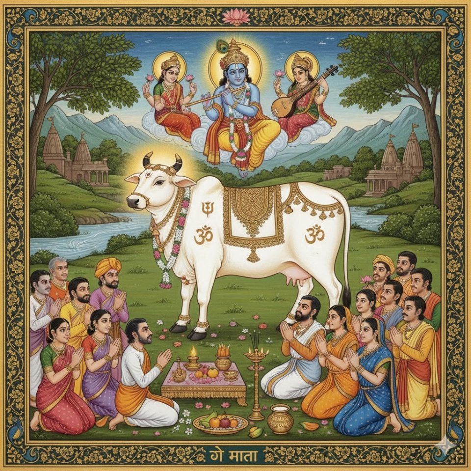 :הפרה היא הסמל החי של אמא-אדמה ושל השפע שהיא מעניקה לאנושות. הפרה, כמו האדמה, היא מקור למזון ולדשנים. על פי המסורת, הפרה מגלמת את נדיבות לבם של האלים. בשל חשיבותה הרבה, ציור או פסל שלה יכולים להיות מנחה ראויה בטקסים דתיים. חמשת הפריטים שמקורם בפרה (Pancagavia): חלב, יוגורט, חמאה, שתן וגללים, משמשים בטקסים הדתיים ומייחסים להם סגולות מטהרות.