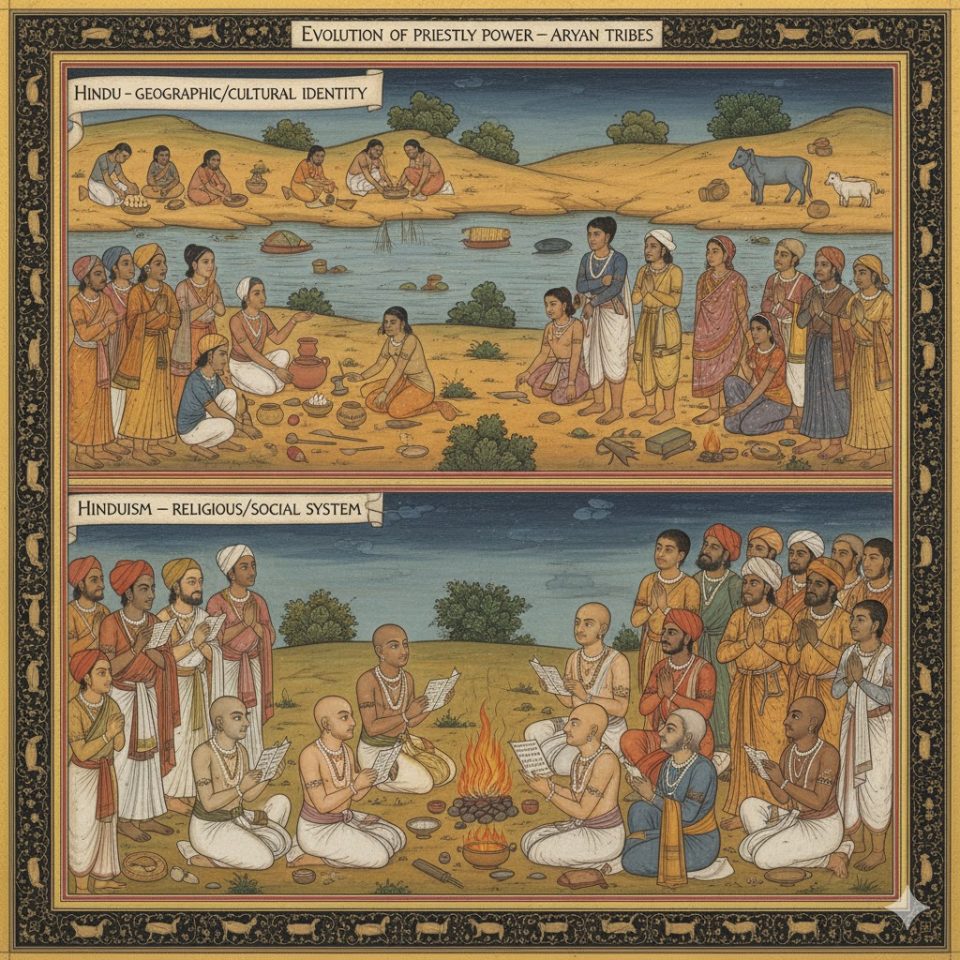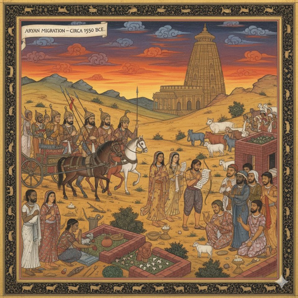 בשנת 1500 בקירוב לפני הספירה, על פי התיאוריה הלשונית הלא מוכחת, חדרו שבטים נוודים אריים (קבוצת עמים אינדו-אירופאים) מכיוון איראן לתת היבשת ההודית והפיצו אמונות ומנהגים ואף הנהיגו מבנים חברתיים חדשים, בקרב הקהילות החקלאיות של עמק האינדוס. מחקרים חדשים מציביעם על ככך שמדובר בפלישה של רעיונות", לא של לוחמים.
