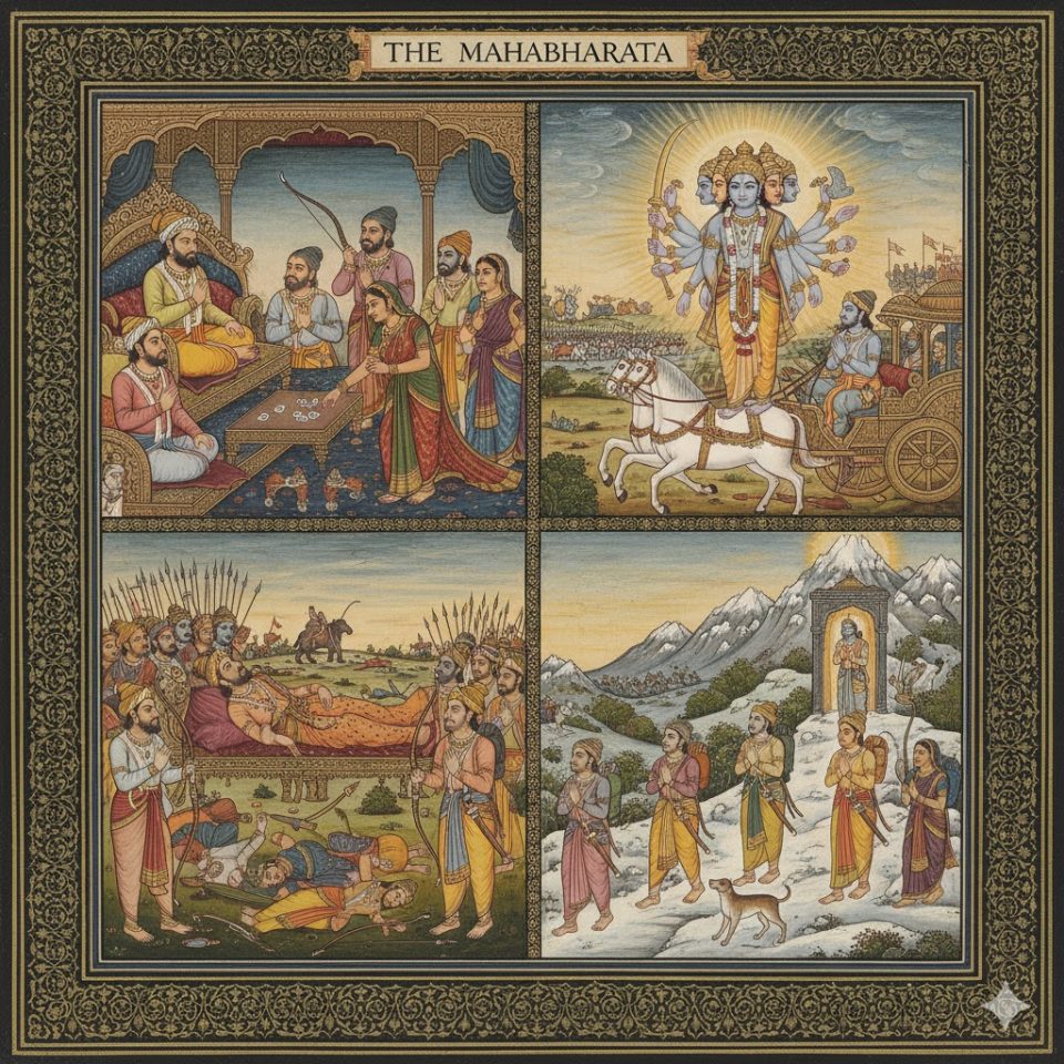 המהבהארטה היא האפוס ההודי העצום – יצירה פיוטית בת יותר ממאה אלף בתים, המגוללת את מלחמתם של בני משפחת קורו, הפאנדווים והקאורווים, על שליטה בממלכה. אך מעבר לסיפור ההרואי, היא מהווה אנציקלופדיה של החיים והחכמה ההינדואית: דיונים על מוסר, צדק, חובה (דהרמה), נאמנות ודרך ההתנהגות הנכונה.