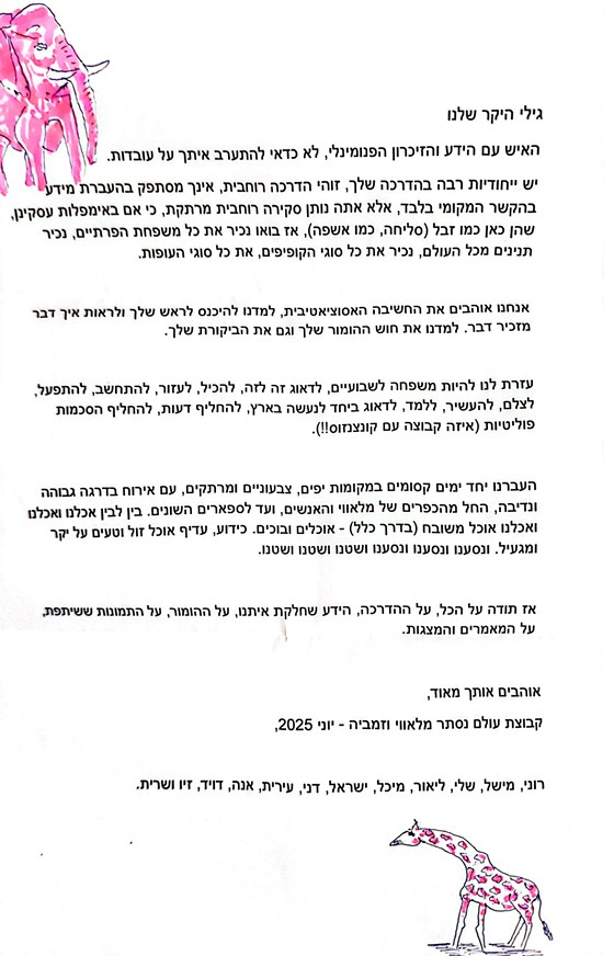 הייתה לנו הזכות ליהנות ולהתעשר מהידע הרב שלך בכל התחומים מה שהוסיף עניין לכל מקום ומקום. ליהנות מהאישיות המיוחדת שלך שמקרינה מצד אחד חברות כנה והרגשה טובה ונעימה לכל אחד מהמשתתפים מה שהשפיע על האווירה הטובה שהייתה ומצד שני מנהיגות שקובעת כללים ברורים.