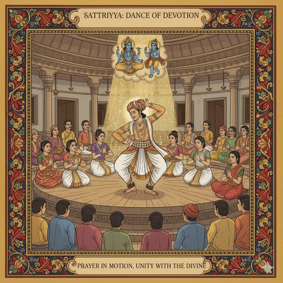 בלב אסאם, במנזרי הסאטרה העתיקים[6] שעל גדות נהר הבראהמפוטרה, נולדה במאה ה־15 אחת מאבני החן של התרבות ההודית – ריקוד הסאטריה (Sattriya). זהו ריקוד שבו הגוף הוא כלי תפילה, התנועה היא מדיטציה, והמוזיקה – שער אל הקדושה. סאטריה איננו רק מופע אמנותי, אלא טקס רוחני המגלם את שאיפת האדם לאחדות עם האל.