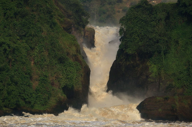 אחר הצהרים יצאנו לשיט על הנילוס הלבן, במעלה הזרם. היה זה מראה מרהיב. ראשית כל, בשל הצמחייה, הטרופית עשירה, שכללה יער עבות, גומא ושטחים גדולים של יקינטון המים, שבלט בעליו הירוקים הבשרניים ובפרחיו הסגולים הגדולים.. כמו נראה שפע של חיות בר, כמו חזירי יבלות, אנפת גוליית, עיטם, נחשונים, עדרי פילים, כולל זכר ענק, קרוקודיל גדול מאד וכמובן, הרבה הרבה היפופוטמים. לאחר כשעה וחצי של הפלגה חזינו במרה המרהיב של מפלי מורצ'יסון (Murchison). זהו אחד מיעדי התיירות המפורסמים של אוגנדה ותחנה ידועה בנתיבו של הנילוס הלבן. כמויות עצומות של מים, נדחקות בשצף קצף אל נקיק, שרוחבו ששה מ' בלבד וניתזות לכל עבר בעוצמה רבה. ניתן לצאת משם בלוויית מדריך מקומי לטיול רגלי אל המפלים. השביל מאפשר נקודות מבט מרשימות אל המפלים, עד מעל למפל עצמו. ענן של רסס עולה לגובה רב יחסית ויוצר קשת נהדרת.