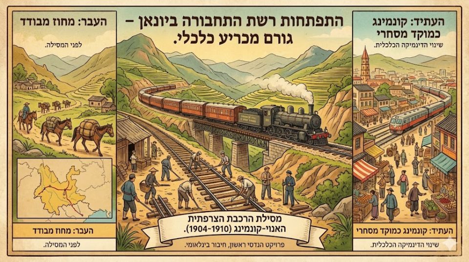 התפתחות רשת התחבורה ביונאן היא אחד הגורמים המכריעים בהתפתחותו הכלכלית של המחוז. מסילת הרכבת הצרפתית שחיברה בין האנוי לקונמינג (1904-1910) הייתה הפרויקט ההנדסי הראשון שהפך את יונאן ממחוז מבודד למחוז המחובר לרשתות סחר בינלאומיות. המסילה הפכה את קונמינג למוקד מסחרי חשוב ושינתה את הדינמיקה הכלכלית של המחוז כולו.