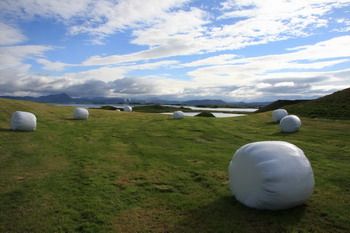 Skutustaôir. ממול לשון יבשה החודרת אל האגם (Alftagerôi Skutustaoagigar).