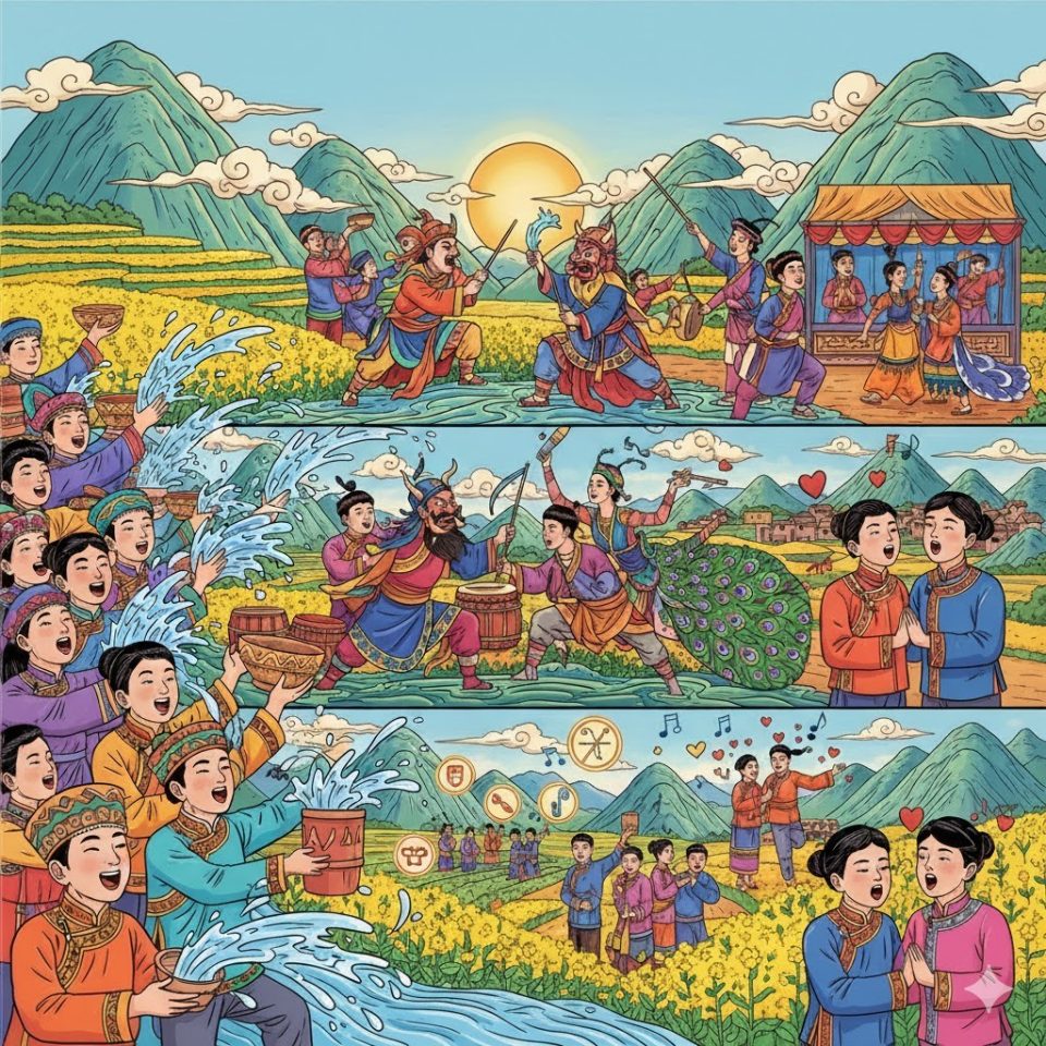 ה-3 במרץ: יום אל ההר והתזת המים: זהו חג רב־פנים המוקדש לאל ההר, ובמרכזו טקסים לגירוש רוחות רעות ותפילות להצלחת היבול. באזור לואופינג שביונאן, הפסטיבל לובש צורה של חגיגת התזת מים לאורך נהר דואויי. המבקרים חוזים בקרבות טקסיים לכבוד אל המים, במופעי תרבות ססגוניים ובפעילויות חיזור מסורתיות, בהן הצעירים מחליפים ביניהם שירי אהבה בקצב השירה האנטיפונלית. בכפרים שסביב גויאנג, מתקיימות תחרויות שירה המכונות "פסטיבל שירת הפיות" או "פסטיבל תולעי האדמה", שמטרתן המאגית היא להגן על השדות מפני מזיקים.