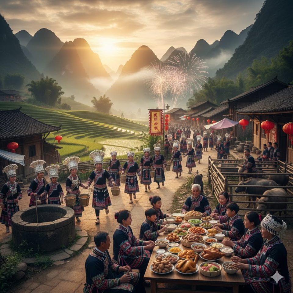 פסטיבל האביב (Spring Festival) באופן מסורתי, הפסטיבל נחגג בחודש הירחי ה-11, אם כי קהילות רבות עוברות כיום ללוח השנה הסיני הכללי. בכפרים כמו פינג טאנג וליבו, התושבים עדיין מקיימים את "השנה הקטנה" ביום ה-30 של החודש ה-11. ההכנות בעיצומן: הנשים שוקדות על הכנת עוגות אורז ומזונות מיוחדים, והריח העז של אלכוהול מקומי בייצור ביתי ממלא את האוויר. ערב השנה החדשה מוקדש להקרבת מנחות לאבות הקדמונים ולמופעי זיקוקים. עם עלות השחר של יום השנה החדשה, נערכת תחרות סמלית: נשים צעירות ממהרות אל המעיין כדי להביא את ה"מים הראשונים" – המכונים "מים חכמים" ונחשבים לסגולה לאינטליגנציה ומזל. באותו זמן, הנערים מניחים אבנים קטנות במכלאות בעלי החיים, אקט טקסי שנועד להבטיח שגשוג ובריאות למשק החי.