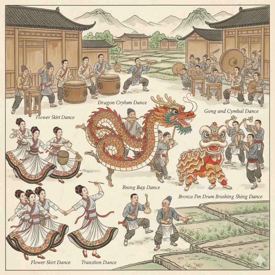 ריקודים מסורתיים כוללים את ריקוד האריגה (Weaving Dance), ריקוד שק התבואה (Grain Bag Dance), ריקוד האריה (Lion Dance), ריקוד הדרקון (Dragon Dance), ריקוד המעבר (Transition Dance), ריקוד הגונג והמצלתיים (Gong and Cymbal Dance), ריקוד החצאית הפורחת (Flower Skirt Dance), ריקוד תוף הארד (Bronze Drum Dance) וריקוד מברשת תוף הארד (Bronze Drum Brushing Dance). צורות חינניות ומבטאות אלה משלבות חיים חקלאיים, מנהגים וטקס לתוך מופע אמנותי.