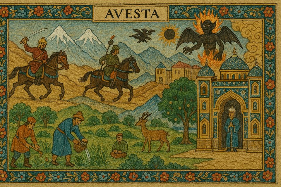 רבים סבורים כי דווקא כאן, בפרט באדמת ח'וראזם הפורייה על חופי אמו-דאריה חוברו הפרקים הראשונים של "אווסטה" (Avesta) – ספר קדוש של דת זרטוסטרא[5]. ואכן קל לדמיין זאת. תושבי האזור גרים בדואליות התמידית בין המדבריות הלוהטות לשלגי העד של פסגות ההרים, בין חום נורא ביום לקור עז בלילה, בין החקלאים השלווים בנאות המדבר לנומדים לוחמניים בשולי המדבר והערבות, בין מוקדי התרבות המשגשגים – על מקדשיהם וארמונותיהם – לבין החולות הנצחיים הקוברים כל דבר. דואליות זו משתקפת היטב גם באמונתם ובמטפיזיקה שלהם: הטוב והרע, האלים והשדים – הציר המרכזי בתורתו של זרטוסטרא.