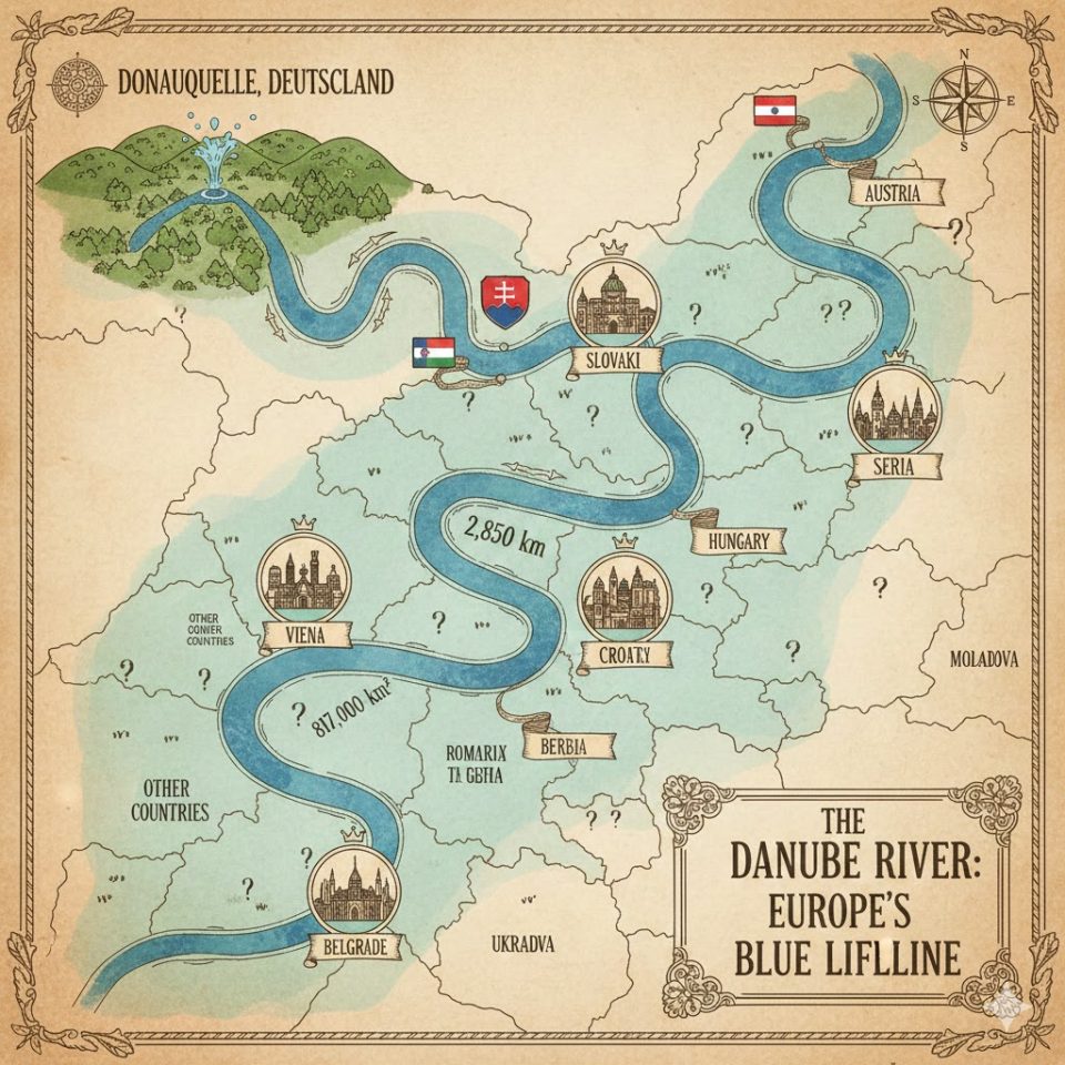 מקור הדנובה בגרמניה, ומכאן הוא זורם בכיוון דרום־מזרח לאורך כ־2,850 קילומטרים. בדרכו הוא עובר בתחומן או לאורכן של אוסטריה (Austria), סלובקיה (Slovakia), הונגריה (Hungary), קרואטיה (Croatia), סרביה (Serbia), רומניה, בולגריה (Bulgaria), מולדובה (Moldova) ואוקראינה (Ukraine). על גדותיו שוכנות ערים רבות, ובהן ארבע בירות לאומיות: וינה (Vienna), ברטיסלבה (Bratislava), בודפשט (Budapest) ובלגרד (Belgrade). אגן הניקוז של הדנובה משתרע על שטח עצום של כ־817 אלף קילומטרים רבועים, וחודר לשטחיהן של תשע מדינות נוספות שמעבר לאלה שבהן הוא זורם.
