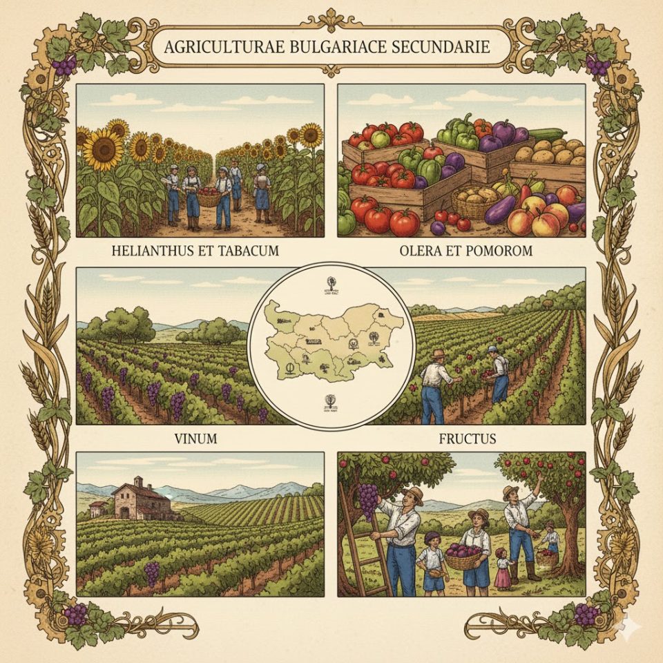 ענף הדגנים הוא הענף החקלאי הראשי, ובראשו חיטה ותירס, המשמשים הן לצריכה מקומית והן ליצוא, ולצדם גידולי שעורה וחמניות, כאשר בולגריה נמנית עם היצרניות הבולטות של שמן חמניות באירופה. ענפים משניים אך חשובים כוללים גידול טבק, שבעבר היה מסמלי החקלאות הבולגרית, וגידול ירקות מגוונים – עגבניות, פלפלים, מלפפונים ותפוחי אדמה – בעיקר במישורים הפוריים ובאזורים מושקים. לענף הפירות והכרמים מקום מרכזי, עם מטעים של תפוחים, שזיפים, דובדבנים, אפרסקים וענבים, והכרמים מקנים לבולגריה מוניטין רב־שנים כיצרנית יין. ענף ייחודי ובעל חשיבות תרבותית והיסטורית הוא גידול ורדים להפקת שמן ורדים, בעיקר בעמק קזנלק, מן המרכזים הידועים בעולם לייצור תמציות ורדים לתעשיית הבשמים. גם גידול בעלי חיים – בקר, כבשים, חזירים ועופות – נוכח במרחב הכפרי, אם כי תרומתו הכלכלית נמוכה יחסית לגידולי השדה.
