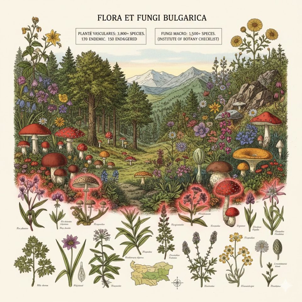 עולם הצומח כולל למעלה מ־3,800 מיני צמחים ווסקולריים, מתוכם 170 מינים אנדמיים ו־150 הנחשבים מצויים בסכנת הכחדה. רשימת הביקורת של פטריות גדולות בבולגריה, שנערכה על ידי המכון לבוטניקה (Institute of Botany), מונה יותר מ־1,500 מינים.