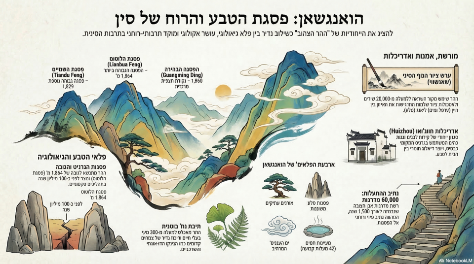 כך הפך הואנג שאן לאחד הנופים ההרריים המזוהים ביותר בסין: רכס שבו כל פסגה, סדק ומצוק נושאים עדות למפגש בין גרניט עתיק, אקלים קר ושחיקה מתמשכת – שילוב שהעניק להר את צורתו הייחודית ואת מקומו המרכזי בנוף הגיאוגרפי והתרבותי של סין.