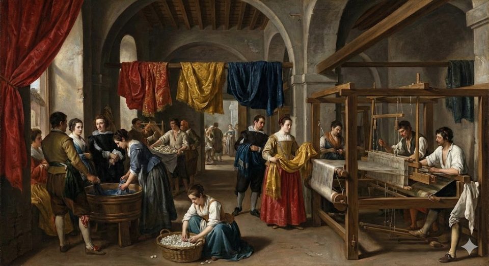 ייצור המשי הוא אחת המלאכות העתיקות והמשפיעות בהיסטוריה האנושית, והוא נולד בסין לפני כ־5,000 שנה. לפי המסורת, גילתה קיסרית סין את סוד הטוויה כאשר פקעת משי נפלה לתוך כוס התה שלה ונפרמה לחוט ארוך וחזק; מכאן התפתחה תעשייה מורכבת ששילבה חקלאות, טכנולוגיה ואסתטיקה. במשך אלפי שנים שמרה סין על סוד גידול תולעי המשי ועל שיטות הפקת החוט, והמשי הפך למוצר יוקרה נדיר שנשא עמו ערך כלכלי וסמלי עצום. רק במהלך האלף הראשון לספירה דלף הידע החוצה – תחילה לקוריאה ויפן, ובהמשך לעולם הביזנטי – עד שבימי הביניים הגיע למערב אירופה. באירופה, ובעיקר באיטליה, מצא הידע קרקע פורייה שהפכה אותו לענף תעשייתי משגשג: גידול עצי התות ששימשו מזון לתולעי המשי, טיפוח פקעות המשי, פיתוח כלי טוויה משוכללים, ויצירת מרכזים עירוניים שכלכלתם נסמכה על מסחר משי. ערים כמו לוקה, ונציה וג'נובה התמחו בטוויה וצביעה, בעוד שפירנצה ומילאנו בלטו בעיצוב ובייצור בדי יוקרה. החדשנות האיטלקית הגיעה לשיא במאות ה־16–17 עם המצאת מכונות טוויה מונעות מים, שהעניקו לאיטליה יתרון טכנולוגי משמעותי והפכו אותה ליצואנית מרכזית של חוטי ובדי משי לכל רחבי אירופה. אף שבמאה ה־19 נפגעה התעשייה עקב מחלות שפגעו בתולעי המשי והתחרות הגוברת מהמזרח, היא שרדה במוקדים אחדים — במיוחד באזור צפון איטליה — והמשיכה לעמוד בבסיס תעשיית האופנה האירופית המודרנית. כך הפך המשי למסע תרבותי־כלכלי יוצא דופן, שהחל כטכנולוגיה סינית סודית והפך לעמוד תווך בהתפתחות המסחר, האופנה והאומנות לאורך אלפי שנים.