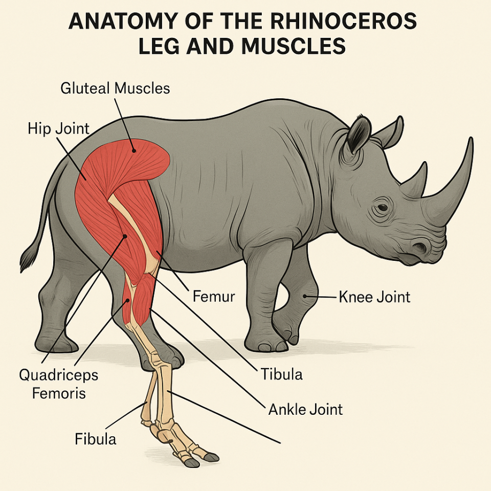 שרירי ירך ועכוז גדולים: שרירים אלו מייצרים את עיקר כוח הדחיפה לפנים, ומאפשרים לקרנף להאיץ במהירות גבוהה יחסית למרות גודלו.