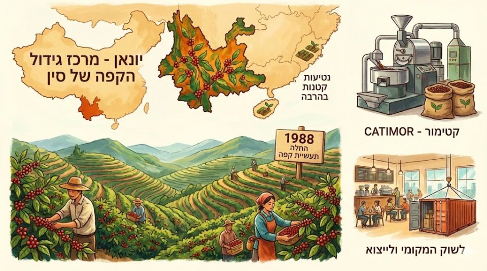 יונאן בולטת במיוחד כמרכז גידול הקפה של סין. המחוז מייצר את רוב הקפה הגדל במדינה (בעוד שבמחוזות אחרים, כגון פוג'יאן והיינאן, קיימות רק נטיעות קטנות בהרבה). גידול קפה בקנה מידה תעשייתי החל ביונאן בשנת 1988, בעיקר באזורים הדרומיים והמערביים של המחוז, המתאפיינים באקלים סובטרופי חמים. הזן הדומיננטי הוא קטימור (Catimor), זן עמיד למחלות המתאים לגידול הררי, והוא מהווה כיום בסיס לענף קפה מתפתח, המכוון הן לשוק המקומי והן לייצוא[8].
