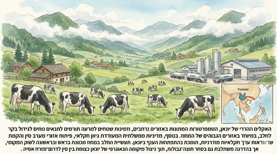 האקלים ההררי של יונאן, הטמפרטורות המתונות באזורים נרחבים, וזמינות שטחים למרעה תורמים לתנאים נוחים לגידול בקר לחלב, במיוחד באזורים הגבוהים של המחוז. בנוסף, מדיניות ממשלתית המעודדת גיוון חקלאי, פיתוח אזורי מערב סין והקמת שרשראות ערך חקלאיות מודרניות, תומכת בהתפתחות הענף ביונאן. תעשיית החלב במחוז מכוונת בראש ובראשונה לשוק המקומי, אך בהדרגה משתלבת גם בסחר חוצה־גבולות, תוך ניצול מיקומה הגאוגרפי של יונאן כצומת בין סין לדרום־מזרח אסיה[13].