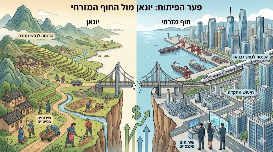 יונאן נותרה בשולי תהליכי הצמיחה המרכזיים. הפער בהכנסה לנפש אינו משקף מצב כלכלי נקודתי בלבד, אלא תוצאה מצטברת של דפוסי פיתוח אזוריים לא-מאוזנים, שבהם עדיפות ניתנה לאזורי החוף ולמרכזים עירוניים גדולים[2].