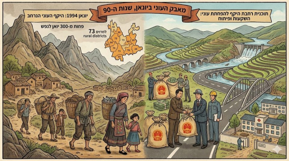 בתגובה יושמה תוכנית רחבת היקף להפחתת עוני, שהתבססה על השקעות ציבוריות משמעותיות ועל תפיסה של פיתוח ארוך טווח. בשנת 2002 בלבד הוזרמו ליונאן כ-3.15 מיליארד יואן במסגרת מדיניות ממוקדת, שהובילה לצמצום האוכלוסייה הכפרית הענייה לחלוטין מ-4.05 מיליון נפש בשנת 2000 ל-2.86 מיליון. התוכנית נשענה על חמישה פרויקטים מרכזיים שנועדו ליצור תשתית לפיתוח בר-קיימא: שיפור קרקעות חקלאיות, פרויקטים של שימור מים והשקיה, הרחבת אספקת החשמל, סלילת כבישים ושיפור הנגישות התחבורתית לאזורים מרוחקים, והקמת "חגורה ירוקה" שנועדה לבלום סחף קרקע ולחזק את הבסיס האקולוגי של המרחב הכפרי.