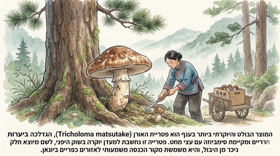 המוצר הבולט והיוקרתי ביותר בענף הוא פטריית האורן (Tricholoma matsutake), הגדלה ביערות הרריים ומקיימת סימביוזה עם עצי מחט. פטרייה זו נחשבת למעדן יוקרה בשוק היפני, לשם מיוצא חלק ניכר מן היבול, והיא משמשת מקור הכנסה משמעותי לאזורים כפריים ביונאן. בכך ממחיש ענף פטריות הבר שילוב ייחודי בין משאב ביולוגי טבעי, כלכלה כפרית ומסחר בינלאומי, והוא משתלב במודל הפיתוח של “חקלאות וביולוגיה” המאפיין את המחוז[11].