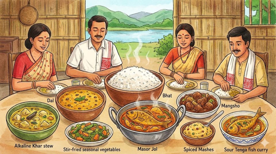 אורז (Bhat) ודגים (Masor Jol) הם אבני היסוד של המטבח. הם מוגשים כמעט בכל ארוחה, לרוב לצד תבשילי עדשים (Dal/Dali), ירקות עונתיים מוקפצים, תבשילי בשר (Mangsho) ומחיות מתובלות עדין. שני מאפיינים קולינריים בולטים באוכל האסאמי הם קאר (Khar) – תבשיל אלקלי הנעשה מתמצית של קליפות בננה מיובשות, וטנגה (Tenga) – תבשיל בעל טעם חמצמץ, לרוב מבוסס על דגים מותססים או עגבניות.