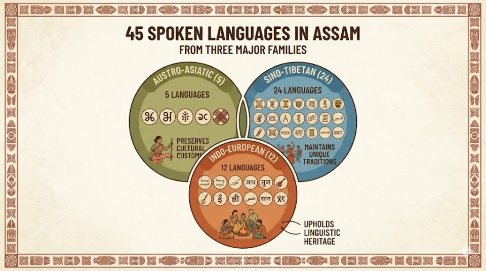 השפות והספרות של אסאם משקפות את הרב־גוניות התרבותית של המדינה ואת מיקומה הייחודי כנקודת מפגש בין עולמות לשוניים שונים – ההודו־אירופי, הטיבטו־בורמני והדרווידי. זהו מרחב שבו שפות עתיקות חיות זו לצד זו, מתמזגות, משפיעות ומתחדשות, ובו השפה היא לא רק אמצעי תקשורת אלא יסוד זהות תרבותית עמוקה.