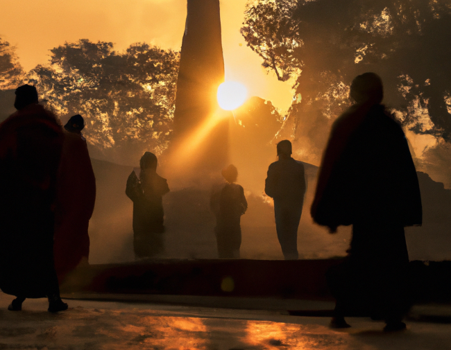 נזירים אחרים מקיפים את המקדש עם כיוון השעון, תוך כדי מלמול מנטרות. המראה מרתק, מכשף, מסעיר, סוחף. קשה להזיז את העיניים. המדריך המקומי תרגל אותי במדיטציה קצרה, בין עשרות שביצעו כמותי, אם כי ברמת גמישות פי מאה טובה משלי. עוד סיבוב ועוד סיבוב. הקשבה לשפות השונות: וייטנאמית, תאית, הינדי, טמילי, טיבטית, סינית, ומה לא. הערב יורד מהר, השמים מצטבעים בוורוד. לרגע קט מאות נרות נדלקים בכל מקום והחשיכה יורדת. פנסים נדלקים, המקדש מואר והפעילות ממשיכה בייתר שאת.