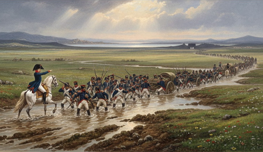 נסיגתו של נפוליאון בונפרטה צפונה באביב 1799 סימנה את אחת התמורות הצבאיות המהירות והדרמטיות שידע מישור החוף של ארץ ישראל. לאחר כיבוש עזה ויפו, נע הצבא הצרפתי – שמנה כ-13,000 חיילים – לאורך הדרך ההיסטורית של מישור החוף. בניגוד לצבאות אחרים, בחר נפוליאון לעקוף את רכס הכרמל ממזרח, דרך נחל עירון (ואדי עארה) אל עמק יזרעאל, כדי להימנע מהמצר הצר של למרגלות הכרמל בחיפה. משם, פנה הכוח מערבה לכיוון מפרץ חיפה דרך המעבר האסטרטגי של "שער העמקים" (פער הקישון). ב-17 במרץ 1799, חצו הכוחות הצרפתיים את נחל הקישון, שהיה מוצף ובוצי בשל גשמי האביב, והתפרסו במישור הרחב של עמק זבולון. תנועה זו בעמק זבולון הייתה קריטית לניהול המערכה. השטח המישורי והפתוח אפשר לנפוליאון לפרוס את צבאו במבנה חצי-סהר סביב עכו, אך המציאות הגאוגרפית של העמק הכתיבה את מיקומי הכוחות: