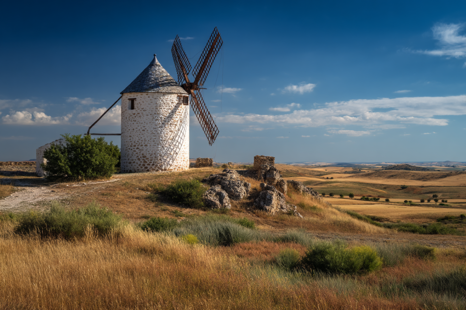 הולכים לתצפית אל הסביבה ואל הטחנות. יש שם תריסר טחנות רוח מהמאה ה-16, הפזורות לאורך רכס Cerro Calderico, חלקן שוחזרו באופן מלא. על פי המסורת המקומית, טחנות הרוח הללו שימשו השראה לסצנה המפורסמת בדון קיחוטה, בה לוחם האצולה נלחם ב"ענקים". כל טחנה נושאת שם מתוך הרומן: "Sancho", "Dulcinea", "Clavileño" ואחרים. לא רחוק מהם נמצאת טירת לה מולה (Castillo de la Muela) היא מצודה מבצר מוסלמי, מימי הביניים מהמאה ה-10, שנבנה על יסודות מבצר רומי עתיק. שימש כנקודת מפתח במלחמות הרקונקיסטה (השבת ספרד מידי המוסלמים) ושימש גם את הנוצרים. כיום, המבצר משוחזר ופתוח למבקרים, כולל סיורים מודרכים ותצפיות נוף מרהיבות על הסביבה.