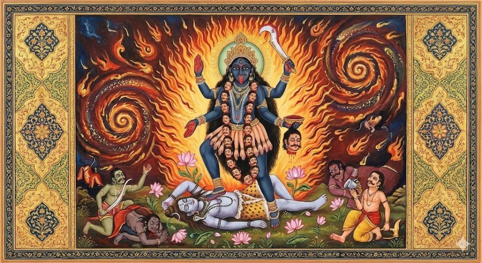 במרכז שכבה זו עומדת דמותה של האלה קאלי (Kali), המופיעה כמקור לאנרגיה ראשונית ובלתי־מרוסנת. בקוסמולוגיה הטנטרית, קאלי איננה רק דמות מפחידה; היא גם אם מגוננת, זו שמחסלת את הכאוס כדי לאפשר חיים חדשים. כוחה ההרסני נתפש כחלק מן המעגל הטבעי של לידה, שינוי והתחדשות – תנועה הכרחית בכל סדר קוסמי. מול קאלי ניצב בן־זוגה המיתולוגי, בהאירב (Bhairava), "המחריד", המגלם את כוח התודעה הממיינת, זו שמרסנת ומנתבת את האנרגיה הגולמית. המתח הדינמי שביניהם – בין פריצת גבולות לבין יצירת סדר – משמש דימוי מרכזי להבנת יחסי הגומלין בין האנושי לאלים, בין טבע פראי לציביליזציה, ובין פחד למגע רוחני עמוק.