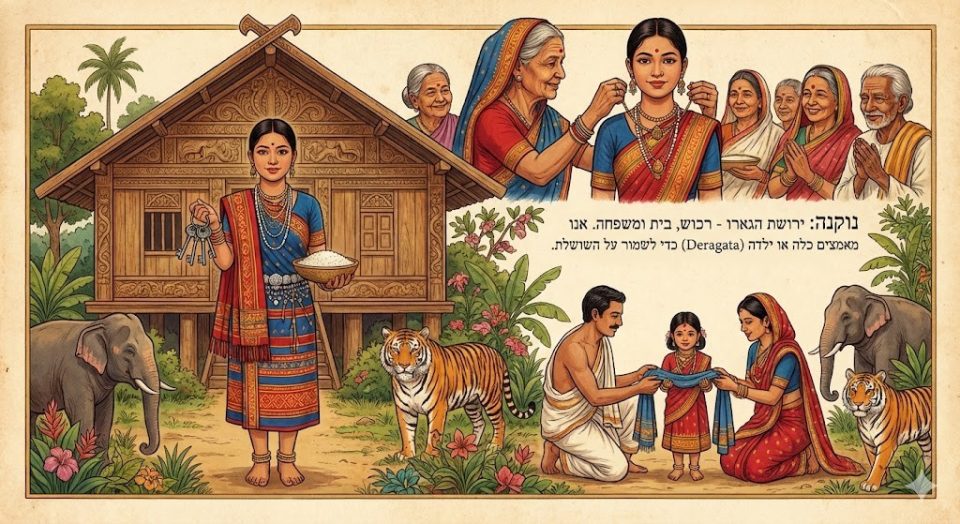 אצל הגארו, הבת הצעירה מכונה "נוקנה" (Nokna), שמשמעו "לבית" או "לבתים". אם אין בנות, הם מאמצים כלה או ילדה (Deragata) שתירש את הרכוש ותהיה ראש הבית. מערכת זו הופכת את מגהלאיה לאחת התרבויות המטריליניות האחרונות בעולם, תופעה נדירה שמושכת חוקרים ומטיילים מכל העולם.