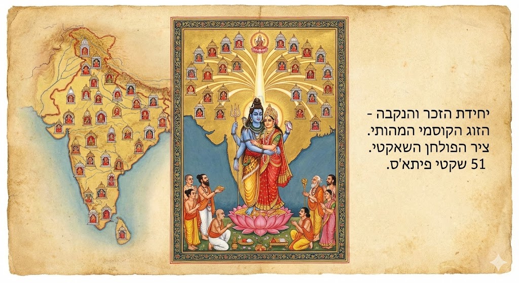 יחידת הזכר והנקבה – הזוג הקוסמי המהותי העומד בבסיס הפולחן השַׁאַקְטי – מהווה את הציר המיתולוגי שסביבו התגבש מוסד 51 השַׁקְטָי פִּיתא'ס (Shakta Pīṭhas). אלה הם מקדשים ושרידים מקודשים הפזורים ברחבי תת־היבשת ההודית, שכל אחד מהם קשור, לפי האגדה, לנפילתם של חלקים מגופה של האלה סאטי (Sati). כל פִּיתָה נתפשת כמוקד רוטט של אנרגיית שַׁקְטי (Śakti) – "הרחב", הכוח הנשי היצירתי והמחייה, זה הבונה ומפרק את מחזורי הקיום. מנגד ניצב בן־זוגה האלוהי, בהירב / בֶּהֵר (Bhairava) – "הברה" – המגלם את התודעה הגברית, הכוח החודר, המייצב והמסדר את המציאות.[3]
