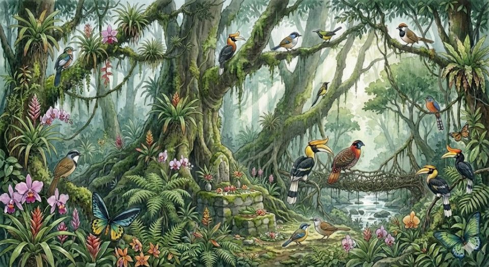 עולם החי מגוון. היערות העשירים של מגהלאיה מהווים אחד מאזורי המגוון הביולוגי המרשימים בתת־היבשת. האקלים הלח, ההפרשי הטופוגרפיה החריפים והמפגש בין הרי ההימאליה לבין אגן ברהמפוטרה יצרו תנאים שבהם שגשוג החיים כמעט מוחשי בכל פינה. באזור זה תועדו 660 מיני עופות, רבים מהם אנדמיים לרכסי ההימאליה, טיבט ודרום־מזרח אסיה – עדות לכך שהמדינה משמשת גשר אקולוגי בין מערכות טבע שונות. מתוך כלל העופות הללו, 34 מוגדרים כמאוימים ברמה עולמית, ו־9 מצויים במצב קריטי, תזכורת חדה ללחצי הציד והפגיעה בבתי הגידול. בין המינים הבולטים אפשר למנות את התרנגול החופי האפור (Grey Junglefowl) ואת הדררה המצויה (Rose-ringed Parakeet), מינים בעלי תפוצה רחבה יחסית, אך תלויים עד היום במקורות מזון טבעיים וביערות פתוחים למחצה.