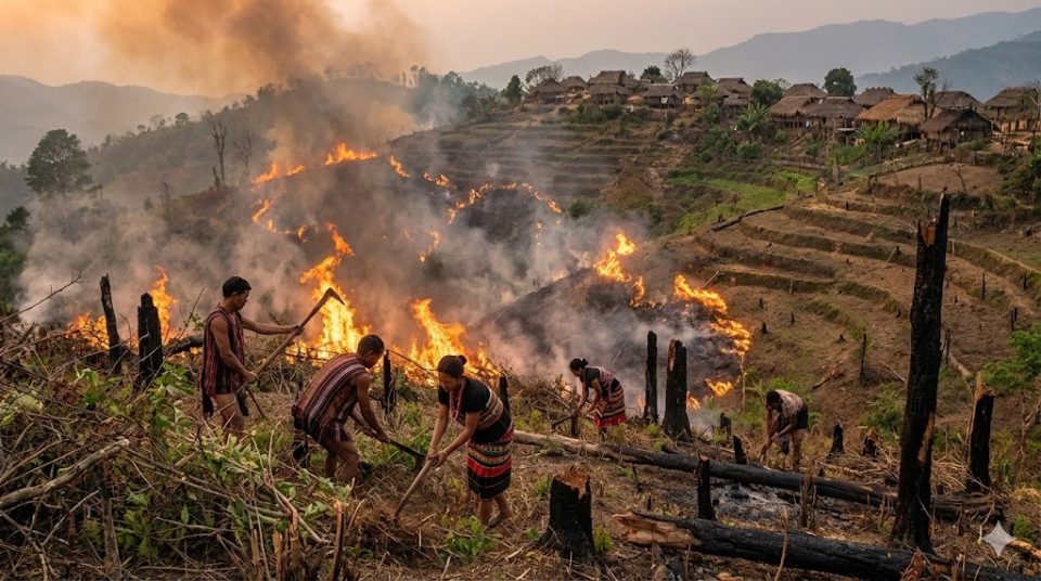 במסגרת שיטה זו, בוחרת הקהילה מדי עונה חלקת יער חדשה במדרונות הגבוהים. הצמחייה נכרתת, היער מתייבש, ולאחר מכן נשרף באופן מבוקר. האפר הנותר, העשיר במינרלים, הופך לדשן טבעי המזין את האדמה. בניגוד לחקלאות הטרסות שאינה זזה ממקומה, כאן האדמה מנוצלת לזמן קצר בלבד: שנה, ולעיתים שתיים. לאחר מכן ננטשת החלקה לטובת חלקה חדשה, והיער מקבל הזדמנות לשוב ולגדול לאורך שנים, לעיתים דור שלם. התהליך כולו משקף תפישה מעגלית של זמן ומרחב – יער שנפתח, נושא יבול, ומחזיר לעצמו את חייו בשקט. חקלאות זו מכונה בספרות המקצועית בשם "חקלאות נדודים" או Shifting Cultivation, והיא מוכרת באזורי יער גשם טרופי, באמזונס, באפריקה ובדרום מזרח אסיה ולא רק בצפון מזרח הודו, שם קיבלה שם מקומי. הייתה נהוגה בעבר הרחוק גם באירופה, כאשר לא ידעו שאפשר לדשן את הקרקע ואפילו נעשו מהלכים כאלה במזרח התיכון ואף בארץ ישראל עד אמצע המאה ה-19'.