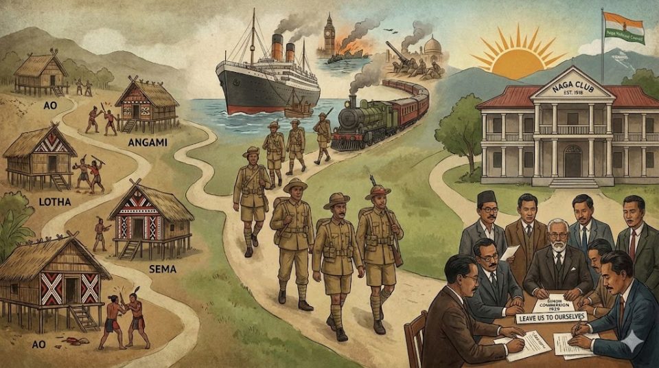 נקודת מפנה משמעותית התרחשה בעקבות מלחמת העולם הראשונה. מאות בני נאגה משבטים שונים – ובהם Ao, Angami, Lotha, Sema ואחרים – גויסו לשירות ב-Labour Corps הבריטי ונשלחו לראשונה אל מחוץ לאזורי ההר המבודדים, בין היתר לחזיתות באירופה ובמזרח התיכון. חוויה זו יצרה לראשונה מפגש בין־שבטי נרחב ובלתי-אלים, וחשפה את המשתתפים לעולם חיצוני מאורגן ולרעיונות של מדינה והיררכיה פוליטית. המפגש חיזק את תחושת הייחוד הקבוצתית מול "האחר", והוביל להבנה כי הנאגה אינם חלק טבעי מהחברה ההודית המתהווה, אלא קהילה נבדלת תרבותית, חברתית ודתית.