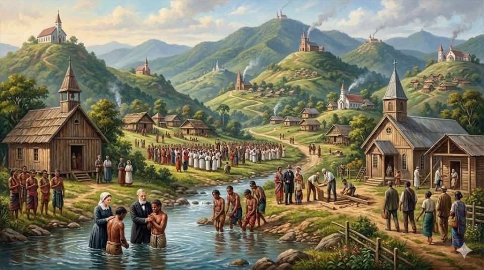 עם הבריטים הגיעו מיסיונרים אמריקאים, בפטיסטים, ופגשו אנשי נָאגַּה באזור סיבסגאר באסאם העילית, אך לא הותר להם להיכנס לגבעות נָאגַּה הסמוכות. בחג המולד 1872 נכנסו אמריקנים ובראשם התיאולוג ד"ר קלארק (Dr. Edwin Winter Clark) ואשתו, והחלו בהטבלת האוכלוסייה בכפר מולונג (Molungkimong) שליד מוֹקוֹקְצ'וּנְג, במרכז המדינה.[2] ב-1894 הקים קלארק את הכנסייה במולונג ושנה מאוחר יותר עבר לכפר אימפור (Impur) שהפך למרכז הדתי של קלארק. ב-1905 הוטבלו 190 איש בהופכם את התנועה הנוצרית לבעלת משמעות. בשנת 1909, בנה הרופא ד"ר ביילי (Dr. James R. Bailey) את המרפאה שלו באימפור, בסמוך לכנסיה.[3] עד 1980 הגיע אחוז הנוצרים בנגאלנד לכ-32% [4] למרות שמעולם מספר המיסיונרים הזרים לא עלה על 10 אנשים. בשנות ה-2000 אחוז הנוצרים הוא כבר רוב מוחלט כשהמדינה מוכרת כמדינה נוצרית בה אין כל פעילות או תחבורה ציבורית בימי ראשון כשקולות השירה הדתית בוקעים מהכנסיות הרבות הפזורות בכל מקום ישוב וחולשות על נקודות התצפית בראשי ההרים. נגאלנד קיבלה את הנצרות אבל לא זנחה את מורשת העבר ואת ההשתייכות השבטית, ולמרות הקדמה עדיין נושאת בגאווה את הפולקלור והגאווה השבטית ומשמרת ככל האפשר את מנהגי השבטים השונים והפסטיבלים הססגוניים עמוק לתוך המאה ה-21'[5].