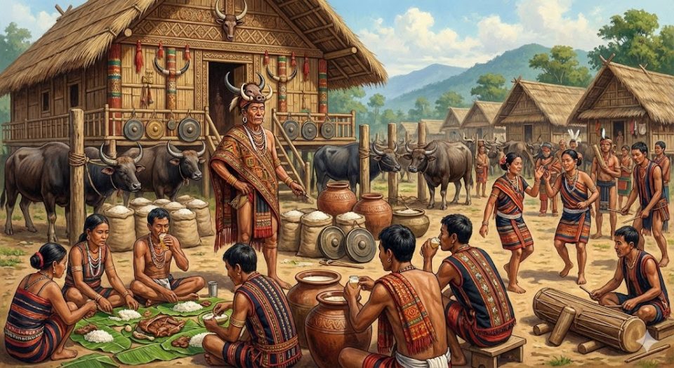 החברה השבטית מאורגנת לרוב סביב קלאנים (מטות) ומשפחות מורחבות, כאשר זקני השבט הם בעלי סמכות מרכזית. אחד המוסדות החשובים ביותר בתרבות זו הוא המורונג (Morung) – בית הרווקים המסורתי המשמש כמרכז חינוכי, שבו מתחנכים הצעירים לערכי השבט, רוכשים מיומנויות עבודה, לומדים טקסים, שירים, סיפורי־עם ומיתוסים. במורונגים מצויה ליבת המסורת: העברת ידע בעל־פה, שמירה על זיכרון היסטורי ושימור הזהות השבטית.